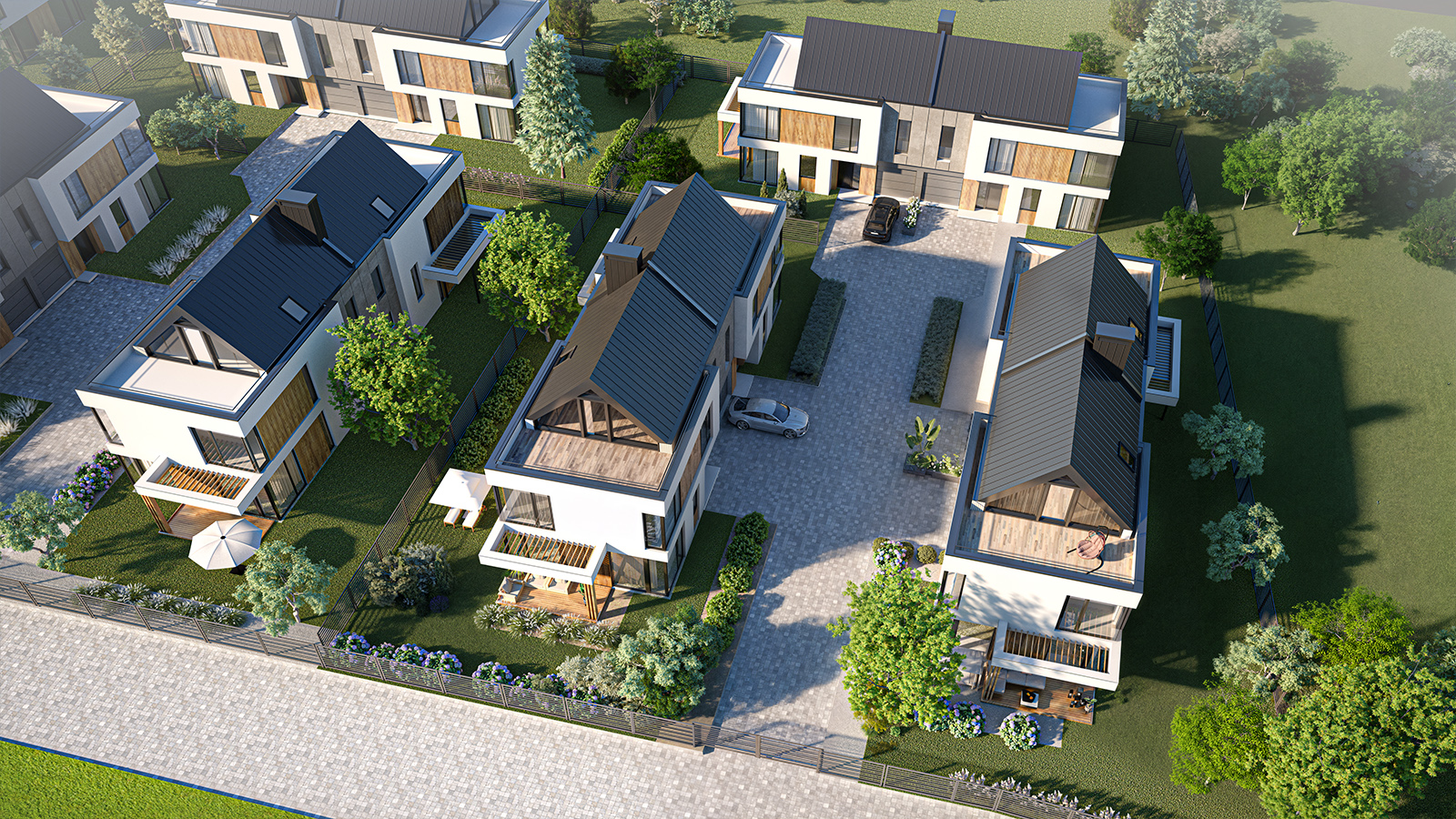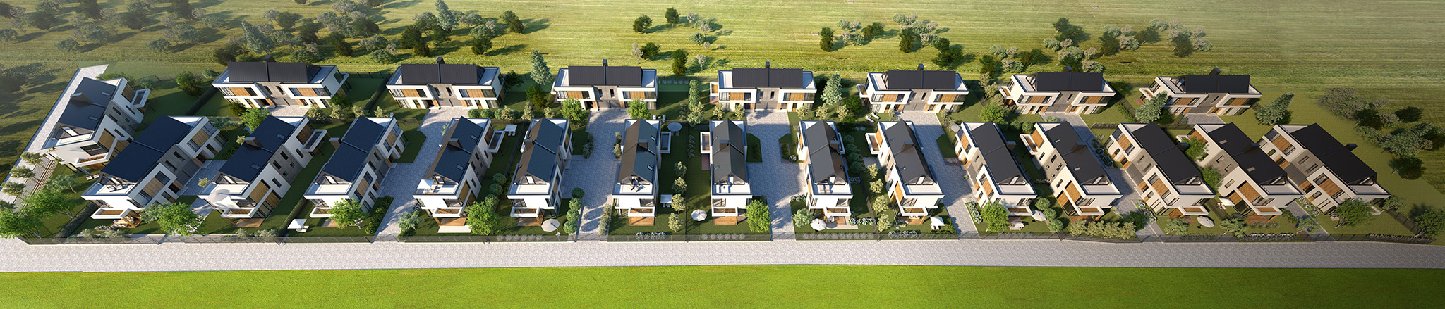 Nasze osiedle składa się z 22 dwulokalowych budynków, oferujących łącznie 44 przestronne domy o powierzchni 192,77 m² każdy. Domy zostały zaprojektowane z myślą o komforcie i funkcjonalności, dlatego wyposażone zostały w trzy miejsca postojowe, w tym jedno w bryle budynku.